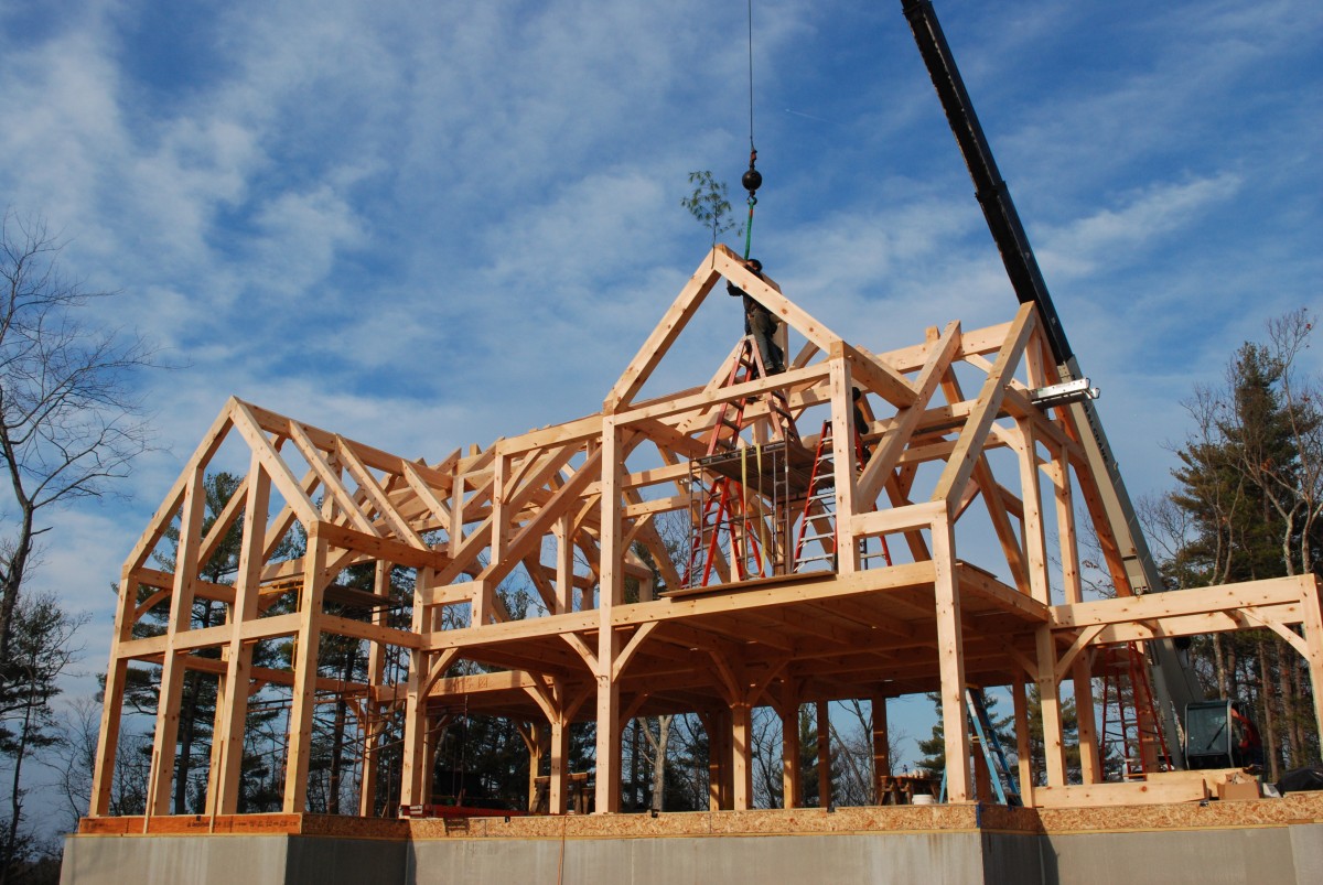 In early December, we spent a week in Harvard, MA, assembling and erecting a timber frame for a new home. The home is a hybrid of traditional timber framing and new SIP technology (the frame will be wrapped in SIPs as well). These are repeat clients (we handcrafted a timber frame for their original home -